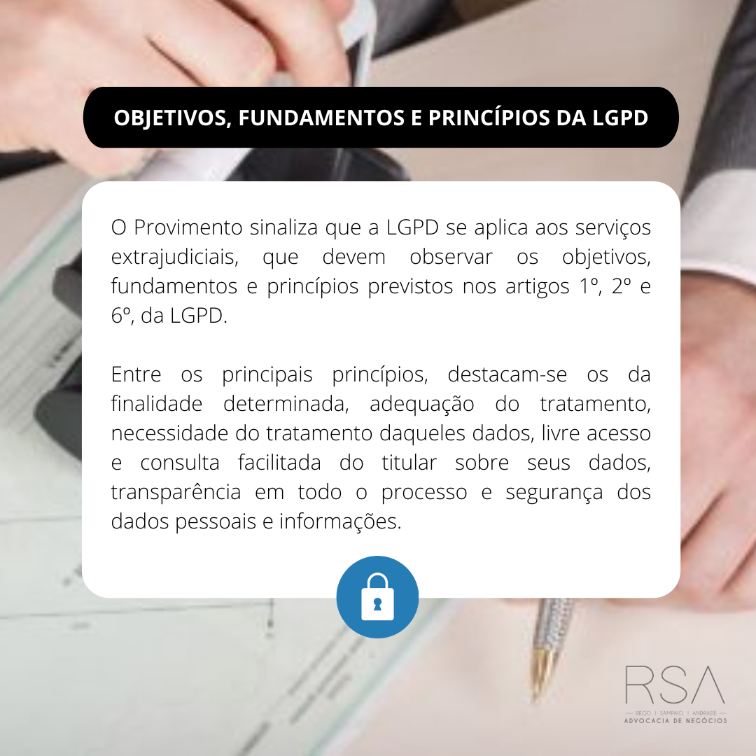 O Provimento sinaliza que a LGPD se aplica aos serviços extrajudiciais e que os delegatários devem observar os objetivos, fundamentos e princípios previstos nos artigos 1º, 2º e 6º, da LGPD.
