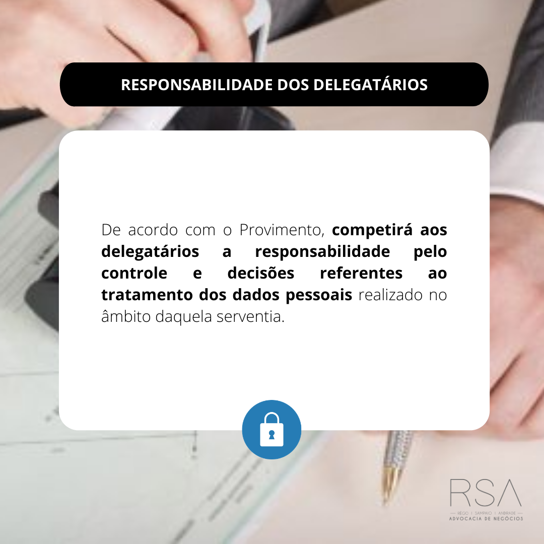 Dessa forma, o artigo 3° do Provimento sinaliza que competirá aos delegatários a responsabilidade pelo controle e decisões referentes ao tratamento dos dados pessoais realizado no âmbito daquela serventia.